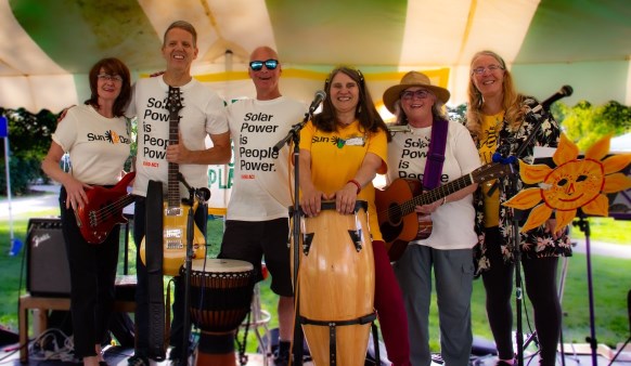 (Photo of six musicians on an outdoor stage, standing and smiling, holding guitars, handdrums, bass guitar, and wearing solar power themed shirts at Sun Day event in front of the State House, Concord, NH)